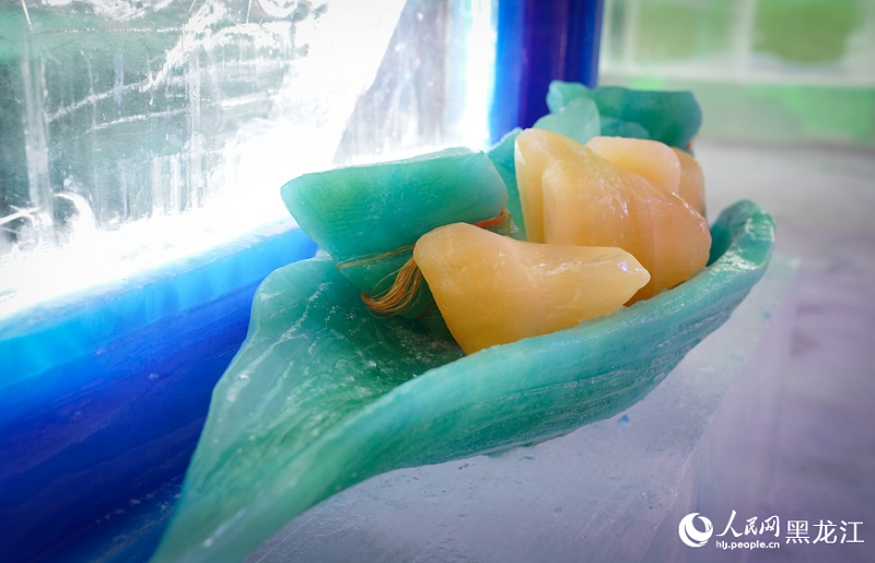 为了迎接端午节的到来,在哈尔滨冰雪大世界,冰雕师们在梦幻冰雪馆全新打造了冰雕景观“粽情端午”,向市民和游客朋友送上节日祝福。
