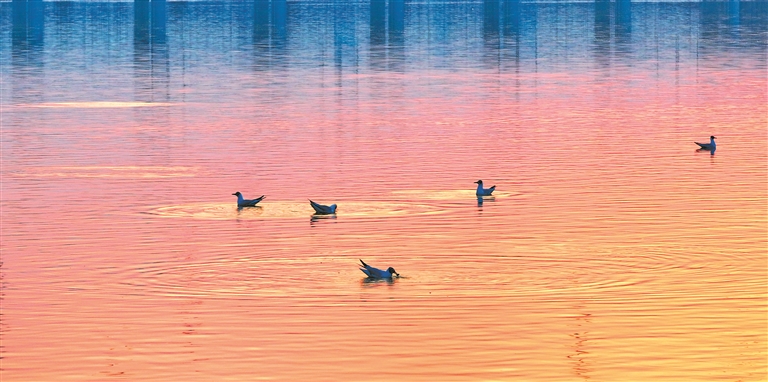 近日,松花江哈尔滨城区段,一个小小的浅滩上,落满羽毛洁白的红嘴鸥、黑尾鸥等候鸟,形成一个“鸥岛”,游客可以在江边儿观赏到万鸥翱翔的美景。(记者 张澍 摄 )