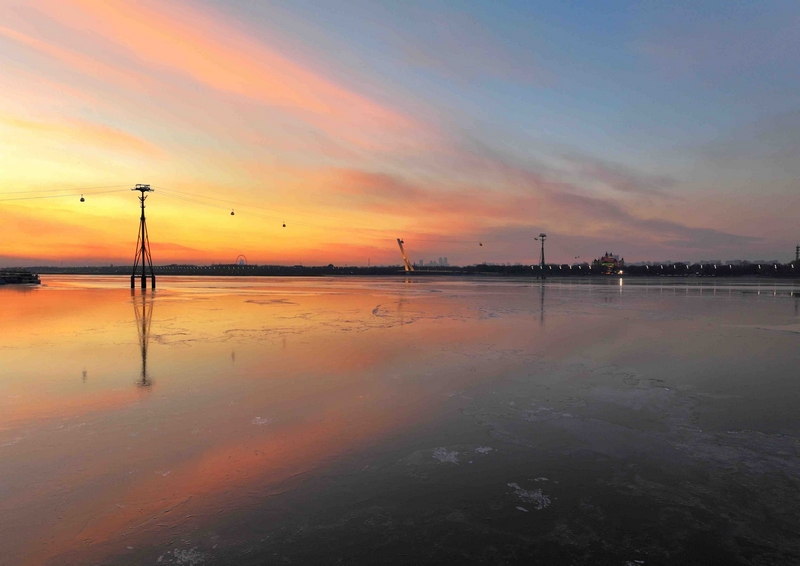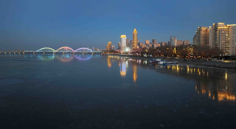 近日,松花江哈尔滨城区段开始结冰。江面新冰晶莹剔透,宛如一面巨大的镜子,静静倒映着江岸的诸多地标。公路大桥的雄伟线条、太阳岛的沧桑轮廓、江上城堡的梦幻造型、太阳桥的现代感、江边高楼时尚气息,都在冰面上清晰呈现,构成一幅如梦似幻的冬日画卷,美不胜收。(记者 张澍 摄影 张澍)