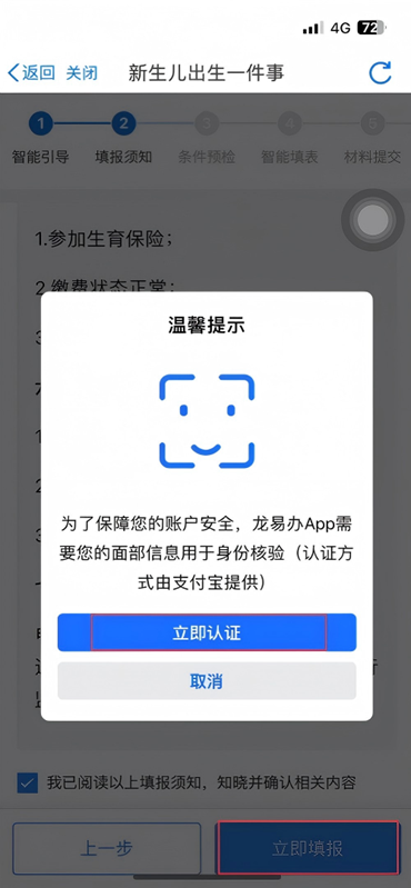 阅读填报须知,进行人脸认证,点击立即填报。