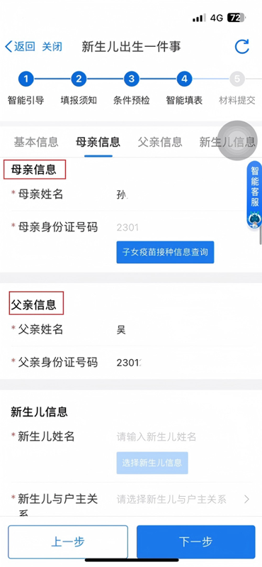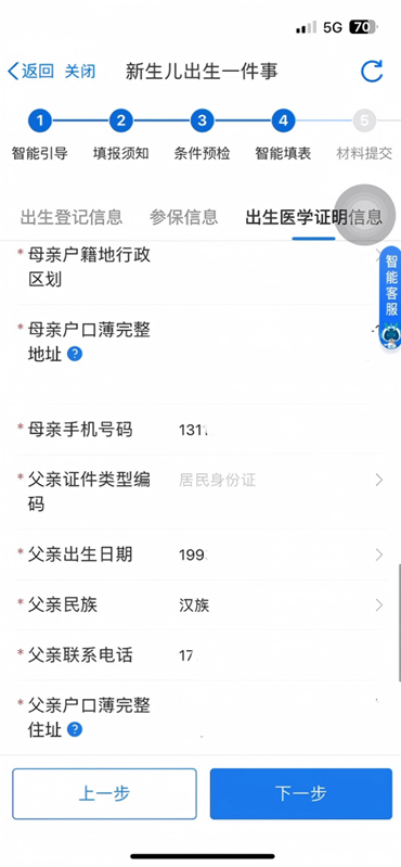 填写母亲信息、父亲信息、新生儿信息、出生登记信息、参保信息及出生医学证明信息。确认无误后,点击下一步。