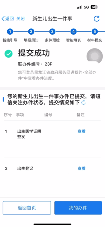 提交申请材料,包括《出生医学证明》首次签发登记表、新生儿父母双方居民身份证、双方居民户口簿、父母结婚证等相关材料。确认无误后点击提交,即可完成办理。