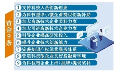 为实现以上目标、任务,《行动计划》推出了颇具含金量的“黄金9条”推进措施,包括支持科技人员创新创业、为科技型中小微企业提供创新补助、加大高新技术企业奖补力度、加大引进高新技术企业力度、引导企业提高研发投入、提升企业技术创新能力、完善知识产权运营服务体系、营造科技型企业良好投融资环境、为科技型企业上市(挂牌)提供奖补等。