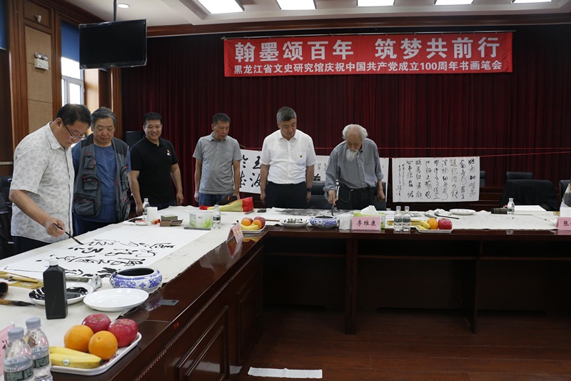 为庆祝中国共产党成立100周年,黑龙江省政府参事室、省文史研究馆以《翰墨颂百年筑梦共前行》为主题,组织部分书画馆员在省城哈尔滨举办了书画笔会活动。室馆党组书记、主任于学胜亲临现场并致辞,党组成员、副主任孙家岩及有关工作人员参加了书画笔会活动。