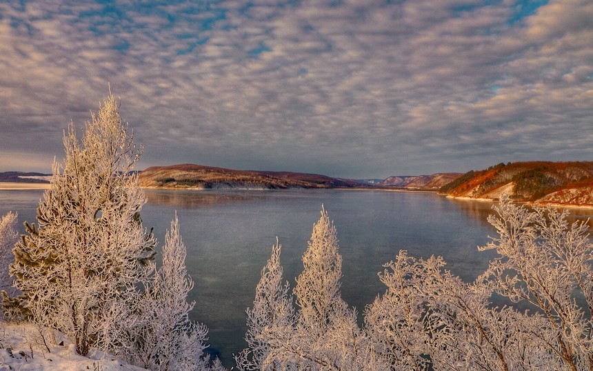近日,黑龙江省黑河市爱辉区卧牛湖风景区出现雾凇美景,湖面雾气缭绕,树枝挂满霜花,勾勒出一幅美丽的自然画卷。