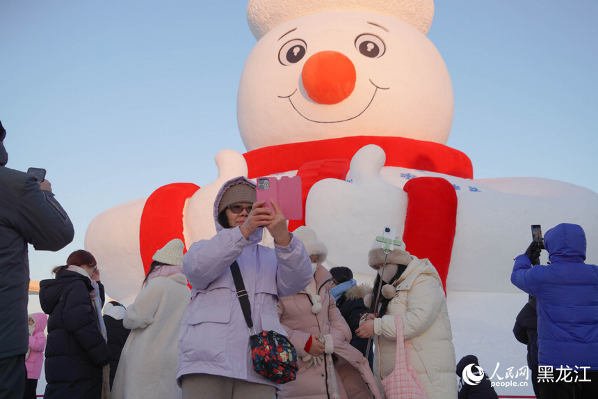 据了解,“雪人先生”高20米,用雪量4000立方米,头戴精致的雪花礼帽,系着红围脖,竖起大拇指,用最真诚的笑容和满满的热情,欢迎每一位远道而来的朋友。(人民网 徐成龙摄影报道)