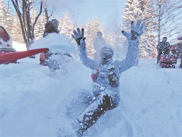 游客在雪乡感受玩雪乐趣。