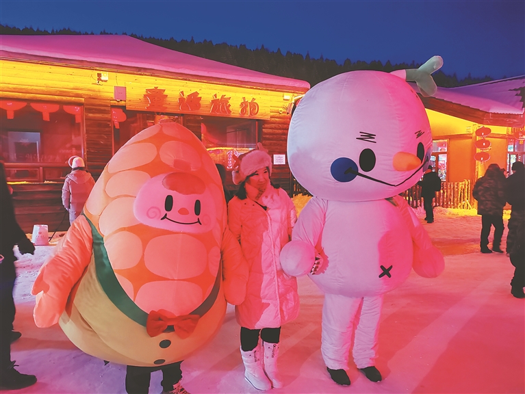 游客与雪乡的卡通人偶合影。