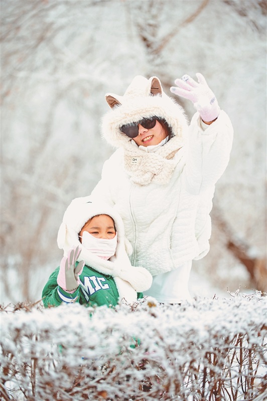 在太阳岛景区,游客们在雪地上尽情撒欢,争相与雾凇美景合影留念。本报记者 张春雷摄