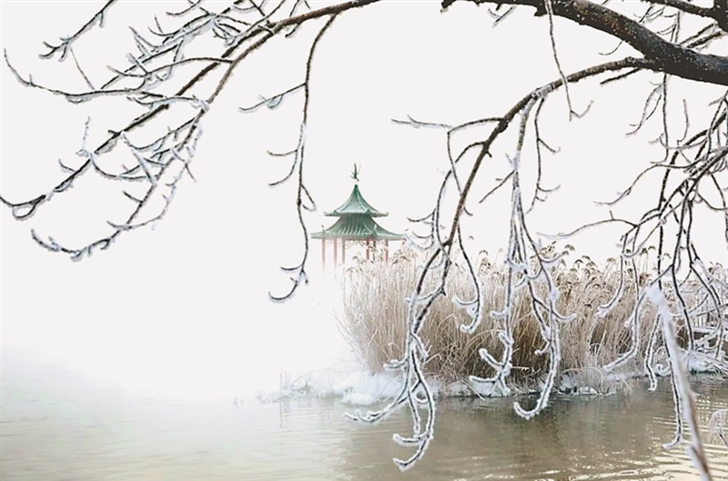 大庆新华湖度假区湖边芦苇沾染了银白,水汽蒸腾弥漫中一方古亭为画面增添了些许诗意。图片由微大庆微信公众号提供