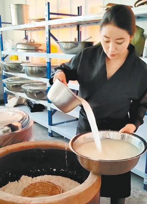 走进李雪的米酒坊,一个长条的木柜台当门而立,柜台后靠墙是一排酒缸,每个半圆形的卡座里都摆着一把椅子,颇有几分酒吧的意思。从柜台里拎出一瓶米酒,快速扭开瓶盖,李雪请记者品尝她酿的酒,略带气泡的酒浆入口酸甜、回甘持久,“经过半年多的试生产,我的‘米乐坊’成了!”李雪骄傲地对记者说。
