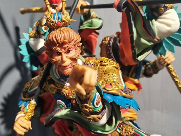 日前,记者走进“天成面塑”工作室,门侧一排展柜摆满了面塑手工制品:笑容满面的仙翁、威风凛凛的门神、憨态可掬的虾兵蟹将……伸手拿起一个三头六臂的美猴王,陈彦桥告诉记者,这是他最喜欢的一件作品,灵感来自“黑神话悟空”形象,图片是在网上找的,但加入了自己的构思:美猴王“金鸡独立”,三根金箍棒交叉架在一起……“我最喜欢这个,很有灵气。”陈彦桥指着其中一个“悟空”,眼里满是光彩。