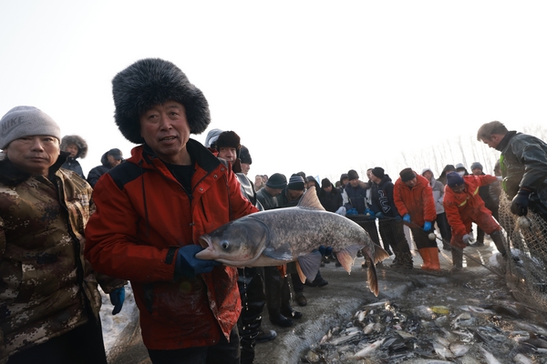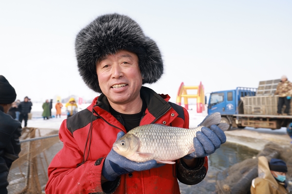 “出鱼啦!”随着号子响起,长达几十米的大网缓缓收拢,肥美的鲜鱼跃出水面,一场冰下的丰收跃然眼前。这一网捕捞量约有3万斤,10余斤重的花鲢活力十足,大大小小的银鲫、鲤鱼、鲢鱼、草鱼跃上冰面,蔚为壮观。肥美的鲜鱼引来乡邻和游客争相观赏、抢购,现场一派“鱼跃人欢”的热闹场面,洋溢着收获的喜悦与吉庆的气氛。
