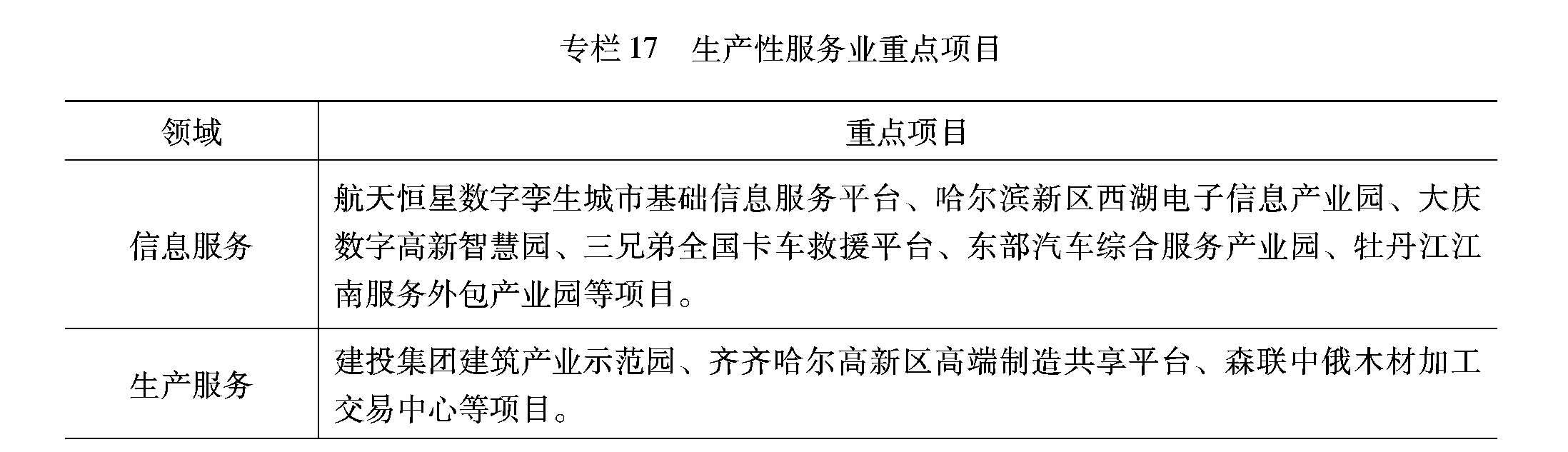 推动生产性服务业向专业化和价值链高端延伸,加快发展工业设计、研发外包、流程诊断、技术测试与分析、信息咨询、现代物流、法律服务等行业,促进现代服务业与先进制造业、现代农业深度融合。大力发展服务型制造,利用新一代信息技术赋能新制造、催生新服务。推动哈电、一重、哈飞、中车齐车等装备制造企业向系统集成和整体解决方案提供商转型,支持石油石化、钢铁、矿产等上下游企业发展配套服务链。培育壮大通用航空产业,发展短途运输、航空旅游、农林作业等通航服务,支持齐齐哈尔建设低空飞行全域覆盖试点城市。加快生活性服务业向高品质和多样化升级,促进健康、养老、育幼、文化、旅游、邮政、体育、培训、家政、物业、广告等产业提质扩容,更好满足多层次、多样化需求。引导平台经济、共享经济健康发展。