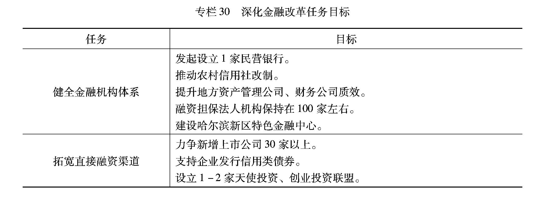 深化金融领域改革。健全金融机构体系,发展壮大总部金融,支持龙江银行、哈尔滨银行等地方法人银行健康发展,发起设立村镇银行,组建民营银行,加快推进农村信用社产权制度改革。加强普惠金融和绿色金融体系建设,发展政府性融资担保机构,加大对实体经济、中小微企业支持力度,缓解融资难融资贵问题,推动企业融资成本保持合理水平。稳慎推进金融产品创新,灵活运用抵质押模式,适当提高中长期贷款和信用贷款比例,开展无还本续贷业务和供应链融资。