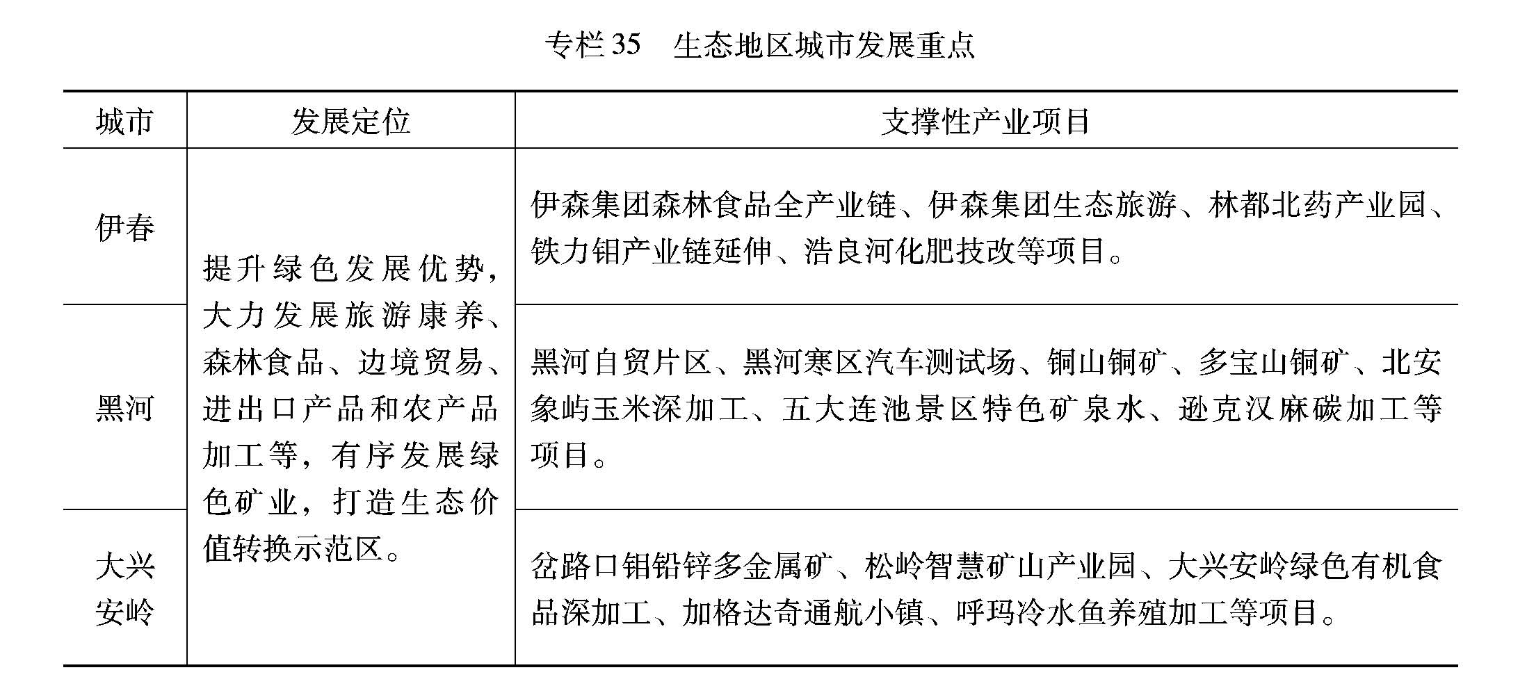 推动大小兴安岭生态地区可持续发展。推动伊春、黑河、大兴安岭地区深化林区体制机制改革,持续强化森林资源保护,增强生态服务功能,创造更多生态产品,筑牢我国北方生态安全屏障。坚持生态产业化、产业生态化,推进绿色发展和经济转型,做大做强林下经济,培育壮大林区生态产业,形成生态富矿。加快完善基础设施和公共服务设施,合理有序推进林场所和自然村屯撤并,促进人口集聚,支持伊春建设国家森林城市,打造大兴安岭生态林城、黑河生态边城。