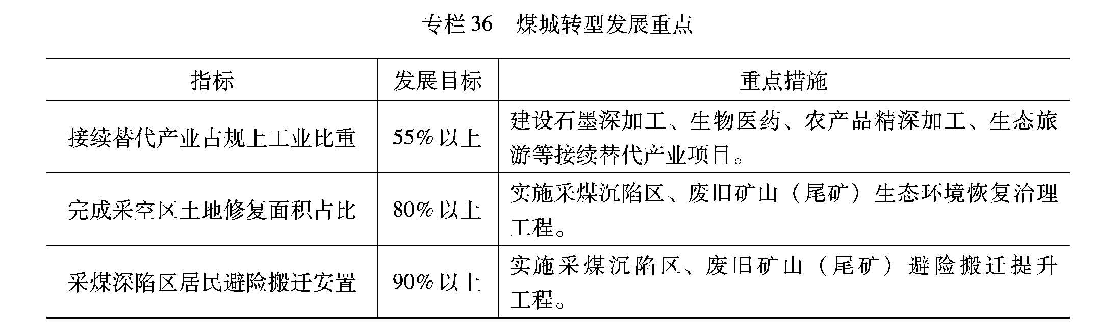 推进资源型城市转型发展。在资源开发、产业布局、财政资金、土地利用等方面加大政策支持力度,加快油城、煤城、林区由单一的资源型经济向多元经济转变。支持采煤沉陷区综合治理和鸡东等独立工矿区居民避险搬迁安置。推进基础设施和公共服务设施改造升级,着力打造优美人居环境,推进棚户区改造,建设山水园林城市、生态宜居城市。探索在煤城、林区建立废弃工矿用地、闲置生产生活用地恢复为耕地或生态用地后,腾退建设用地指标在省内流转使用机制,盘活存量土地资源。