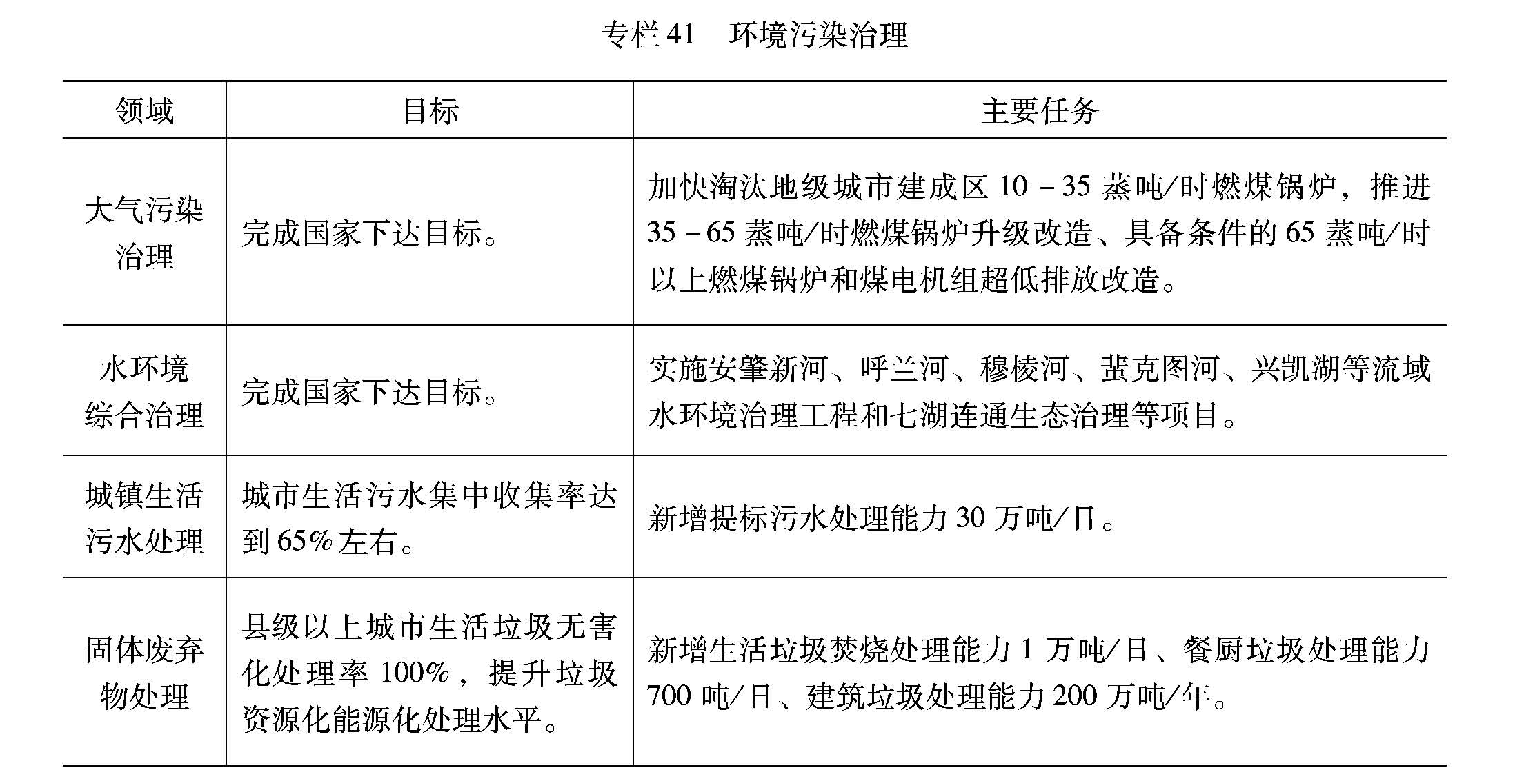 持续打好污染防治攻坚战。完善环境保护、节能减排约束性指标管理,实行排污许可证制度,强化多污染物协同控制和区域协同治理,实现减污降碳协同效应。持续改善大气环境质量,推进哈尔滨新区煤改气试点建设,提高火电、钢铁等重点行业超低排放水平,基本消除重度及以上污染天气。实施散煤污染治理“三重一改”攻坚行动,重点地区散煤使用量削减50%,哈尔滨市主城区建成区基本实现散煤清零。推进清洁取暖,逐步扩大智慧供暖试点,支持利用生物质、地热、干热岩等清洁能源供暖。开展挥发性有机物全过程综合整治,严格执行秸秆禁烧政策,优化哈大绥区域重污染天气应对联防联控机制。持续提升水环境质量,重点实施安肇新河、呼兰河等流域综合治理,加强饮用水源地保护和地下水污染综合防治、信息共享,推进工业集聚区和城镇污水处理设施建设,基本消除城市黑臭水体,全面消除劣Ⅴ类水体。开展土壤污染风险管控和治理修复,严格执行建设用地土壤环境准入管理,实施农用地土壤环境质量分类管理。优化城乡固体废弃物处理设施布局建设,推动哈尔滨、大庆、鹤岗土壤污染综合防治先行区建设。加强塑料污染治理,推广应用替代产品。加强危险废物、医疗废物收集处置。