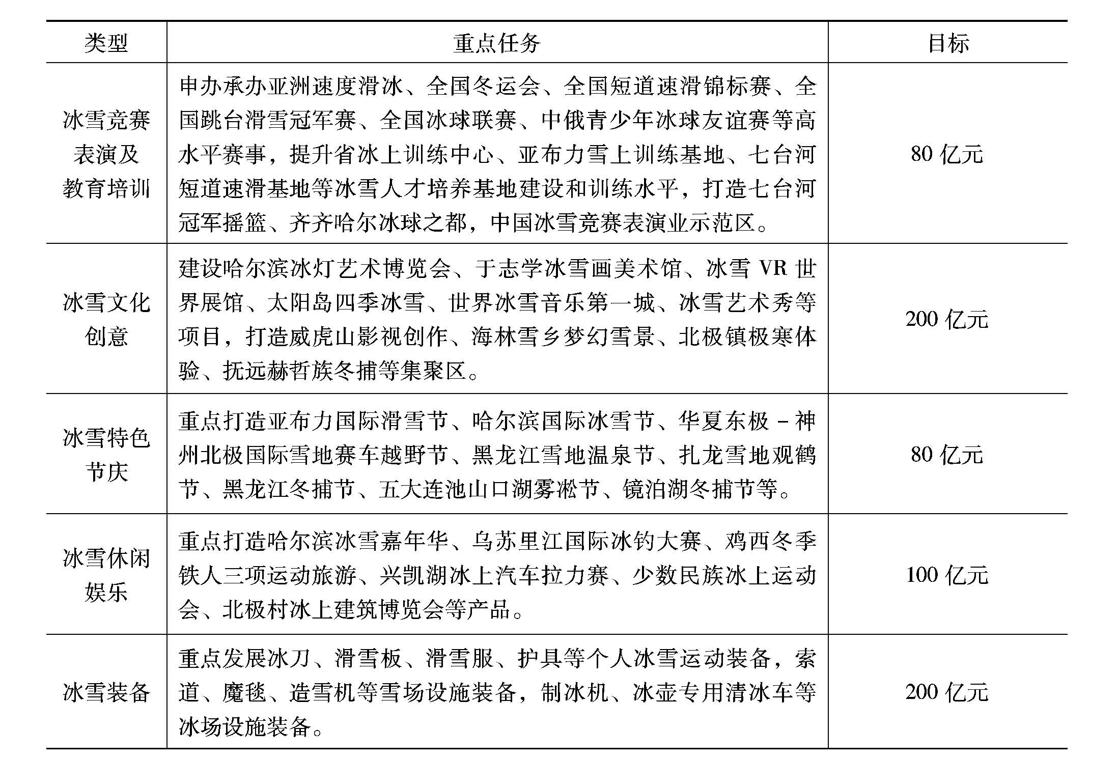 践行“冰天雪地也是金山银山”理念,探索建立多元化的冰雪资源价值实现路径机制,积极推进冰雪资源产业化,把冷资源变成热经济。推动冰雪产业高质量发展,打造国际著名冰雪产业大区和冰雪经济强省,到2025年冰雪产业总产值突破2100亿元。拓展大冰雪产业空间格局,以哈尔滨冰上产业核心区、泛亚布力滑雪大区为中心,建设哈大齐冰上产业带、哈亚牡伊滑雪产业带、边境国际冰雪产业合作带。构建大冰雪产业体系,促进冰雪旅游、冰雪运动、冰雪文化、冰雪节庆、冰雪娱乐、冰雪装备、冰雪教育培训等协同创新发展,培育冰雪全产业链,打造成最具知名度和影响力的冰雪旅游首选目的地、人才培养基地、装备研发制造基地和赛事承办地。弘扬和传承龙江冰雪文化,加快创意产品开发。做大哈尔滨、齐齐哈尔、牡丹江、大庆、伊春、七台河、绥化等冰雪装备产业和项目,支持黑龙冰刀、鸿基索道、乾卯雪龙等龙头企业发展壮大,打造全国领先的大众冰雪装备、竞技冰雪装备、寒地装备产业集群。支持黑河、大兴安岭、抚远等地建设汽车寒地测试和培训基地。实施冰雪优秀运动员、教练员、裁判员培养工程,开展“百万青少年上冰雪”活动。