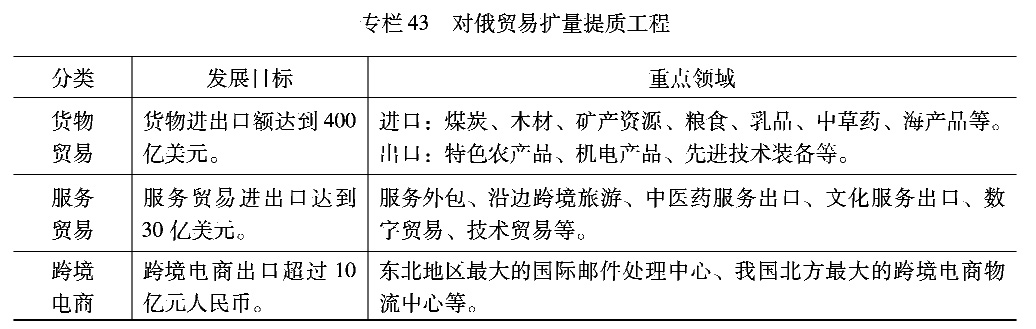 推动对俄贸易扩量提质。发挥区位优势,提升对俄贸易层次、拓展对俄合作领域,巩固我国对俄经贸合作“排头兵”地位。稳步扩大能源资源类商品进口,扩大特色农产品、机电产品、先进技术装备等属地产品出口。着力推动对俄边境贸易创新发展,加快推进边民互市贸易进口商品落地加工试点,培育边境贸易新增长点。大力发展对俄服务贸易,提升旅游、运输、建筑等传统服务贸易规模,建设中医药、文化、技术等服务出口基地,打造中俄数字经济创新发展区。培育对俄贸易新业态,支持增设跨境电商服务试点城市,加快跨境电子商务综合试验区建设,推进跨境电商边境仓、海外仓建设,扩大跨境电商零售进口试点。大力培育和引进外贸综合服务企业。
