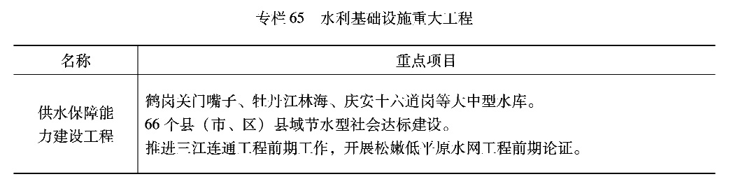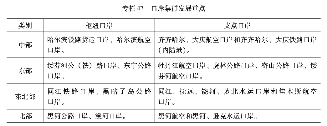 水运。进一步提高黑龙江、松花江、嫩江、抚远水道等重要航道干支衔接和通畅水平,统筹乌苏里江、松阿察河等界河航道建设,提高通航保障率。推进内河主要港口和界河港口装备改造和集疏运体系建设,提高港口服务能力。加快与铁路、公路融合衔接,发挥客货集散功能。