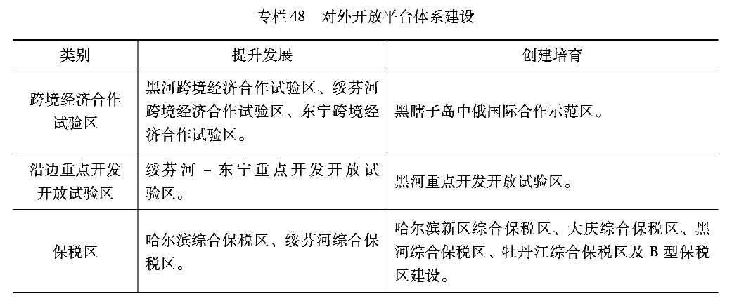 大力发展“特区”经济。主动对接国际规则和市场,加快建设高水平、多元化对外开放合作平台,提升外向型经济质量和规模。加强沿边重点开发开放试验区先行先试,推动对俄跨境经济合作试验区建设,促进跨境产业链融合,探索区域一体化合作新模式。加强黑瞎子岛中俄联合保护开发规划对接,建设黑瞎子岛国际合作示范区。推动互市贸易区创新发展,支持在有条件的地方增设综合保税区和B型保税区,增强国家级和省级开发区对俄合作承载能力。