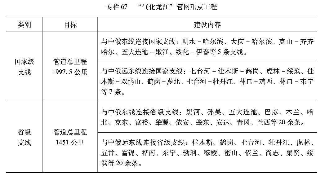 实施“气化龙江”工程。坚持全省一张网、融入全国网、市县全覆盖,配合推进中俄远东天然气管道建设,实现国家级支线管道连通12个地级市、大兴安岭地区LNG/CNG点供。加快储油储气重点项目建设,建立多层次天然气储备体系。合理制定天然气终端价格,因地制宜实施天然气替代,拓展天然气利用领域,重点发展工业燃料替代、交通用气、清洁取暖、分布式能源和调峰发电、天然气化工。