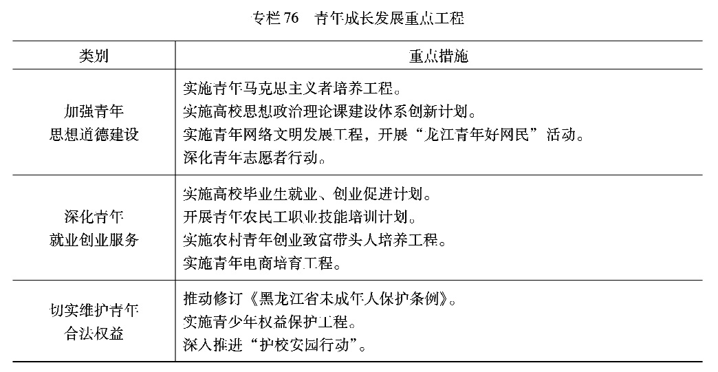 落实党管青年原则,完善青年发展政策体系和工作机制,优化青年成长环境,建设青年友好试点县市,引导更多青年在龙江创业置业就业,促进青年发展事业与经济社会同步发展。实施黑龙江省中长期青年发展规划,坚持以青年为本,尊重青年主体地位,着力提升青年思想政治素质和全面发展水平,充分发挥青年在全面建设社会主义现代化国家新征程中的生力军和突击队作用。