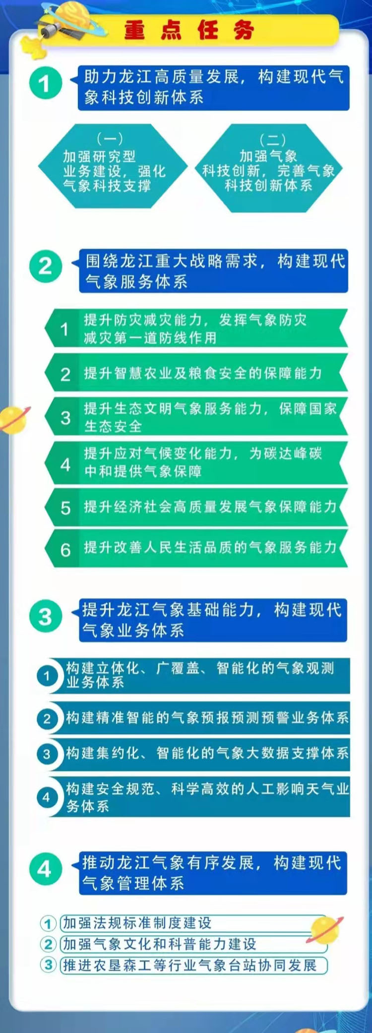 《规划》明确五方面重点任务,一是加强研究型业务建设,强化气象科技支撑和创新,完善气象科技创新体系,构建现代气象科技创新体系,助力龙江高质量发展。二是围绕龙江重大战略需求,提升防灾减灾、智慧农业及粮食安全保障、生态文明气象服务、应对气候变化、经济社会高质量发展气象保障、改善人民生活品质气象服务等方面的能力,构建现代气象服务体系。三是构建立体化、广覆盖、智能化气象观测业务体系,精准智能气象预报预测预警体系,集约化、智能化的气象大数据支撑体系和安全规范、科学高效的人工影响天气业务体系等现代气象业务体系,提升龙江气象基础能力。四是加强法规标准制度建设,强化气象文化和科普能力建设,推进农垦森工等行业气象台站协同发展,构建现代气象管理体系,推动龙江气象有序发展。五是强化部门内部合作及部门间的协作,深化国际合作与交流,构建开放合作的龙江气象新发展格局。