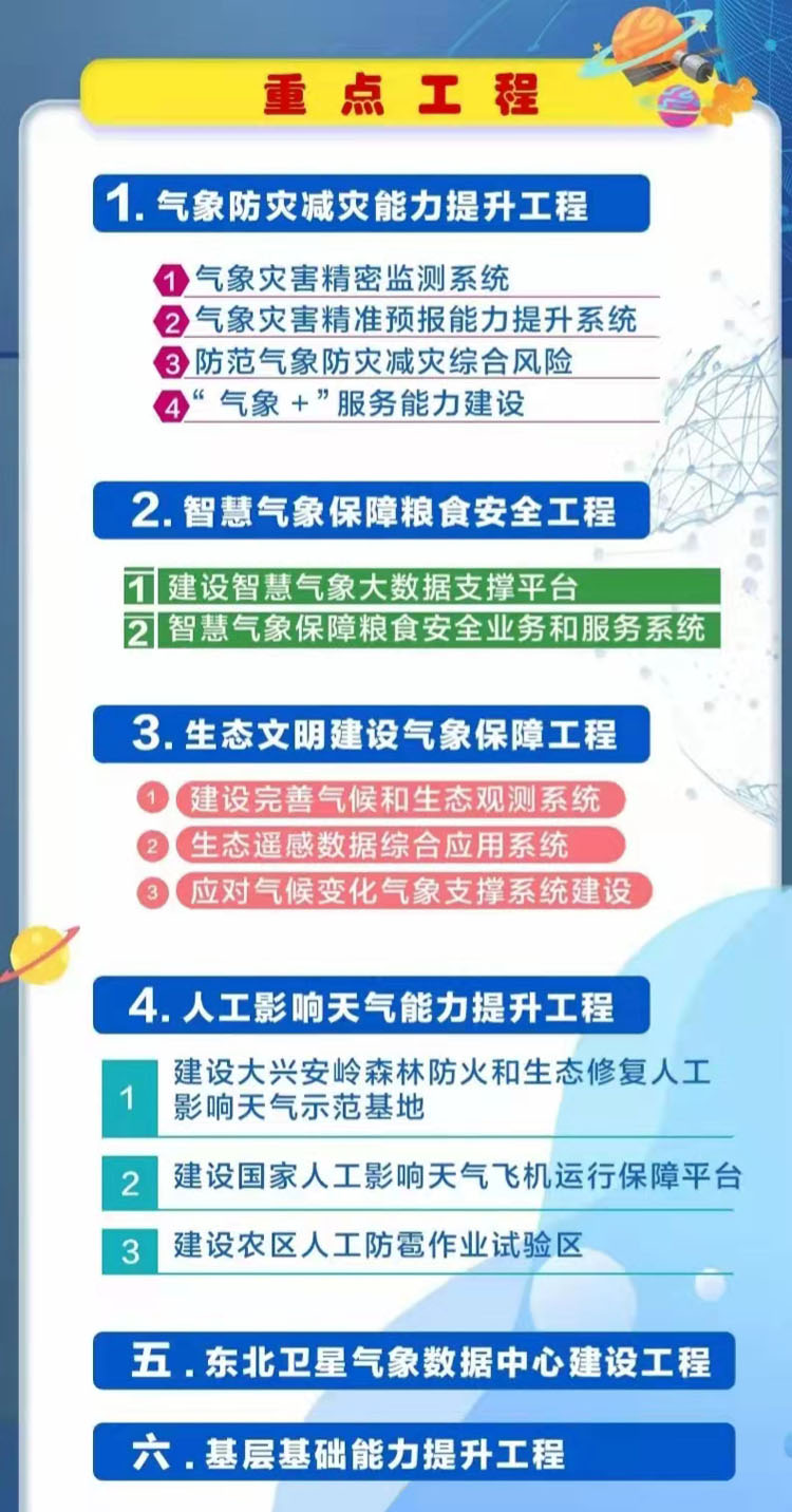 《规划》聚焦重点任务,确立了气象防灾减灾能力提升、智慧气象保障粮食安全、生态文明建设气象保障、人工影响天气能力提升、东北卫星气象数据中心建设、基层基础能力提升等六项重点工程,并从组织领导、财政保障、气象人才队伍建设、监督检查等方面明确了具体举措,为“十四五”期间龙江气象事业发展提供了坚强的支撑保障。