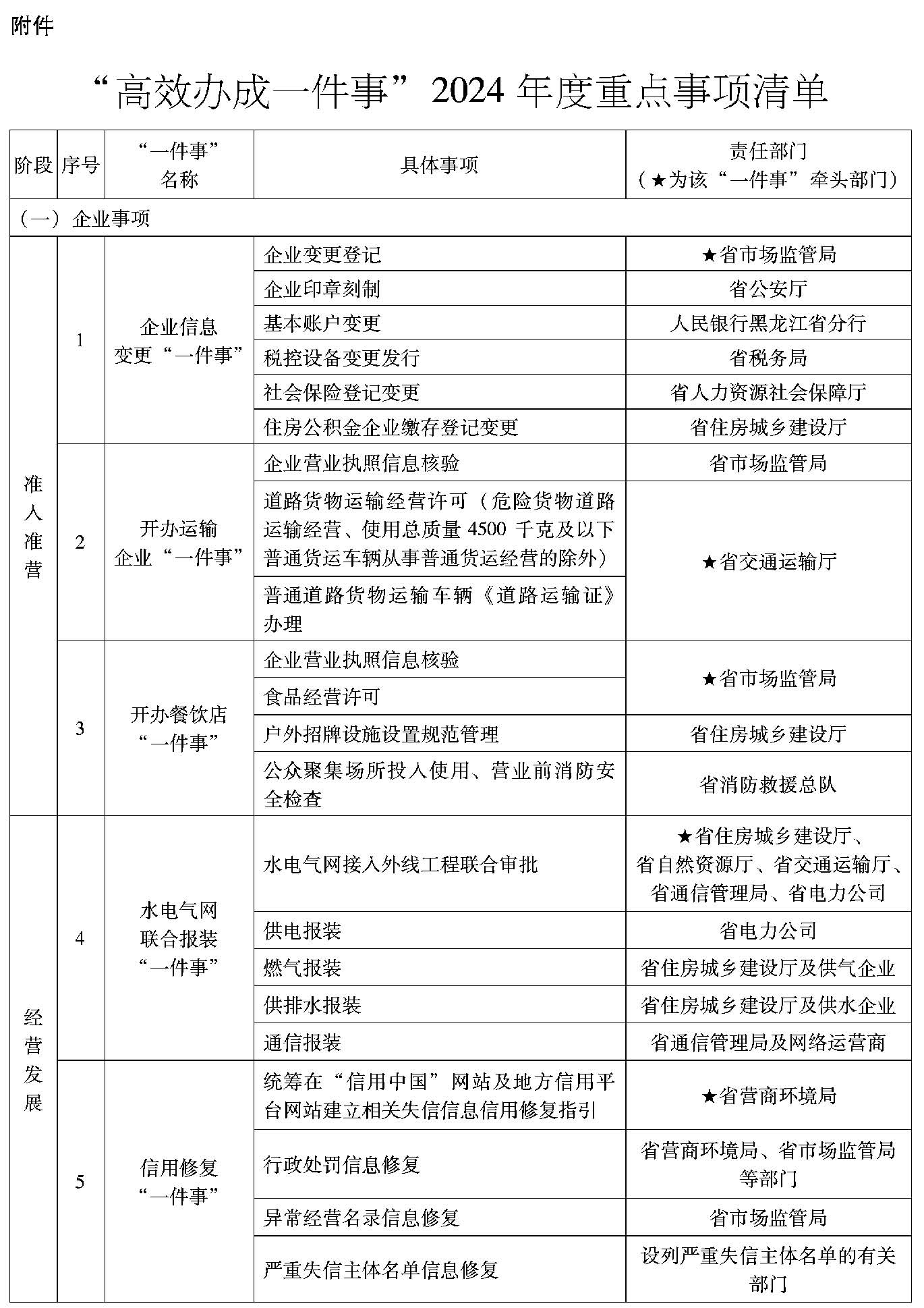 (十八)落实主体责任。对列入国务院“高效办成一件事”集中攻关和创新示范重点事项的,牵头部门与责任部门于2024年3月底前完成全部改革任务,实现实质性运行,形成可复制可推广经验;其他“一件事”重点事项于2024年6月底前完成全部改革任务,实现实质性运行。牵头部门与责任部门要加强协同配合,研究制定工作方案,明确目标任务、改革措施和职责分工,并指导、协调和督促本系统“高效办成一件事”工作。各市(地)人民政府(行署)负责统筹推进本地“高效办成一件事”工作,结合实际持续拓展“高效办成一件事”事项范围。
