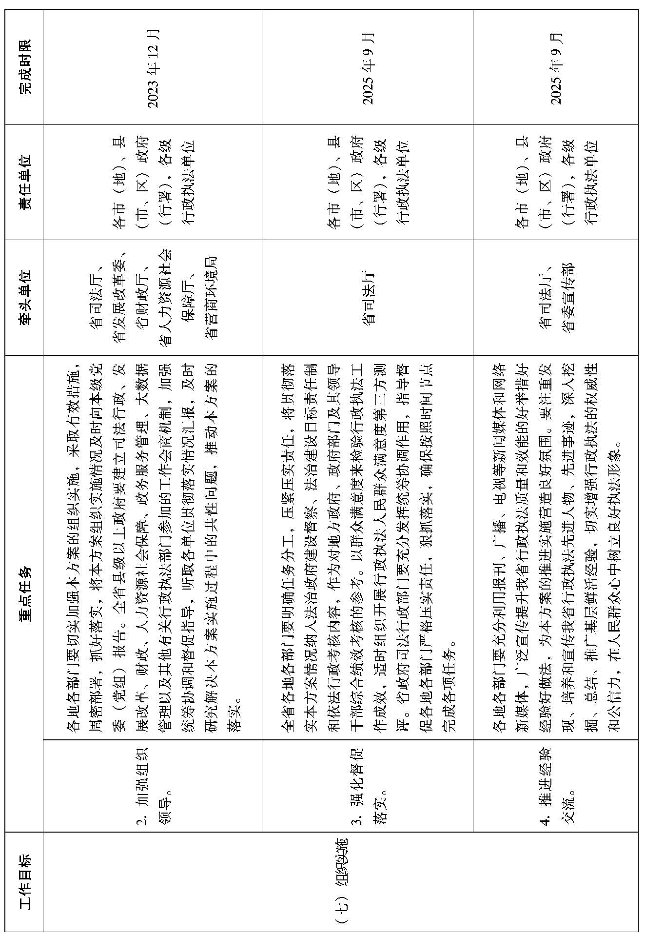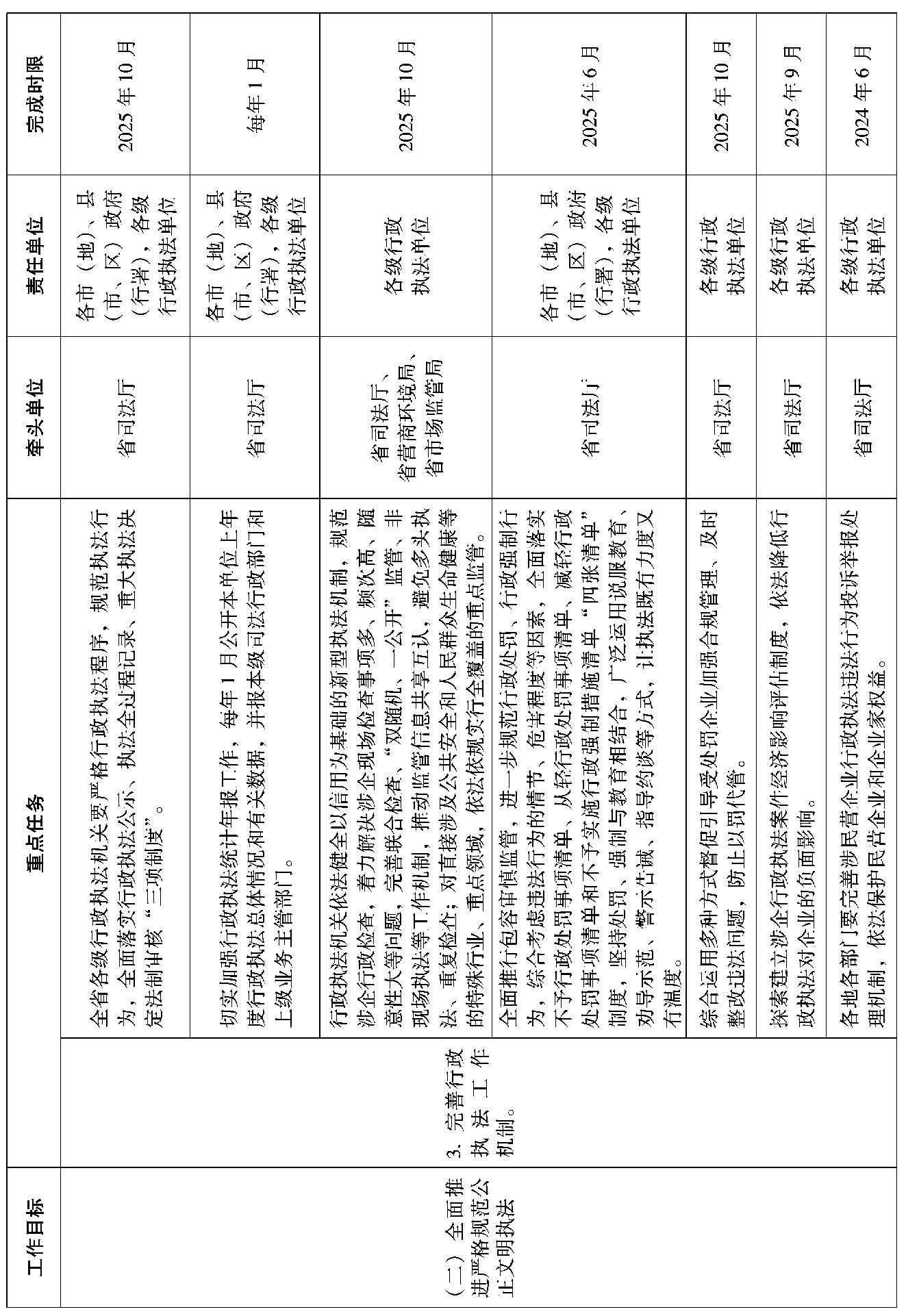 (三)主要目标。立足我省行政执法实际,践行执法为民理念,聚焦人民群众反映强烈的执法问题,系统推进、统筹实施,到2025年底,全省行政执法突出问题得到有效整治,行政执法工作体系进一步完善,行政执法队伍素质明显提升,行政执法协调监督机制和能力建设切实强化,行政执法信息化、数字化水平和科技保障能力进一步提升,严格规范公正文明执法水平和行政执法质量、效能显著提高,行政执法的权威性和公信力有力增强,人民群众对行政执法的满意度大幅上升。
