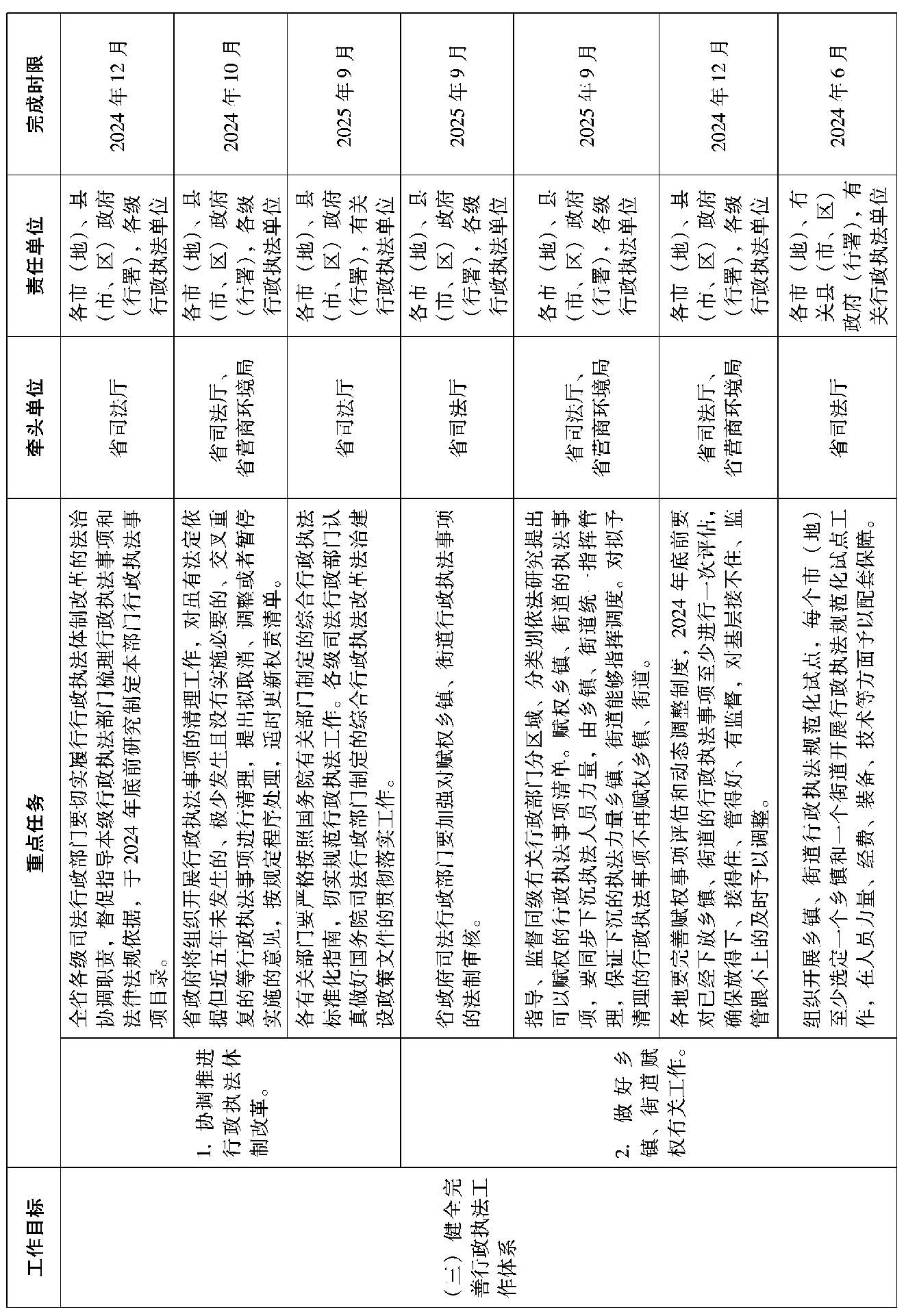 1.协调推进行政执法体制改革。全省各级司法行政部门要切实履行行政执法体制改革的法治协调职责,督促指导本级行政执法部门梳理行政执法事项和法律法规依据,于2024年底前研究制定本部门行政执法事项目录。省政府将组织开展行政执法事项的清理工作,对虽有法定依据但近五年未发生的、极少发生且没有实施必要的、交叉重复的等行政执法事项进行清理,提出拟取消、调整或者暂停实施的意见,按规定程序处理,适时更新权责清单。各有关部门要严格按照国务院有关部门制定的综合行政执法标准化指南,切实规范行政执法工作。各级司法行政部门认真做好国务院司法行政部门制定的综合行政执法改革法治建设政策文件的贯彻落实工作。